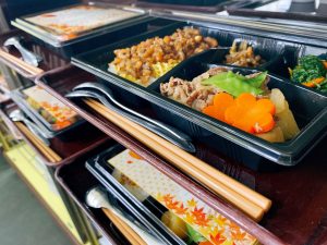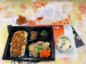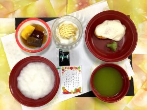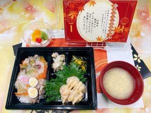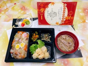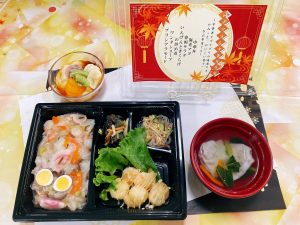 食欲の秋がやってまいりました。9月は「秋のお楽しみ弁当」と題し、メインのお弁当、汁物、デザートを各フロアでそれぞれ選んでいただく行事食を開催しました。