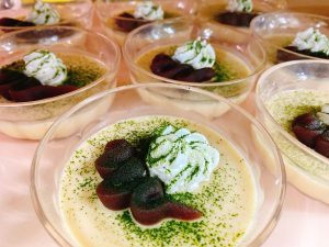 3時のおやつには、マロンババロアをベースにホイップクリームとあずき、抹茶を使ったマロンパフェをご用意しました。嚥下の悪い方にはこしあんを使っています。