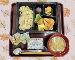 主食は秋の味覚、ぶなしめじと舞茸を加えたきのこ御飯です。副食には、定番のから揚げに、栗の入ったコロッケと彩りの良いふくさ焼き、鮮やかな紅葉おろし和え、食後の甘味に水まんじゅうもご用意いしました。たくさんの具材を入れた豚汁は、旨味たっぷりで身体も温まり、今日のような肌寒い日にぴったりの1品でした。
