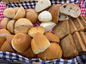 今回はお食事とともに、黒糖食パン・レーズンロール・バターロール・ホワイトブレッド・胚芽ロールの5種類のパンと、苺・ブルーベリー・リンゴ・メープルのジャム4種とマーガリンをご用意し、利用者様にお好きなものを選んで召し上がっていただきました。
