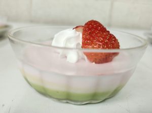 実は、お食事以上に(!?)力を注いだのが、手作りおやつ“ひし餅風3色ババロア”です!