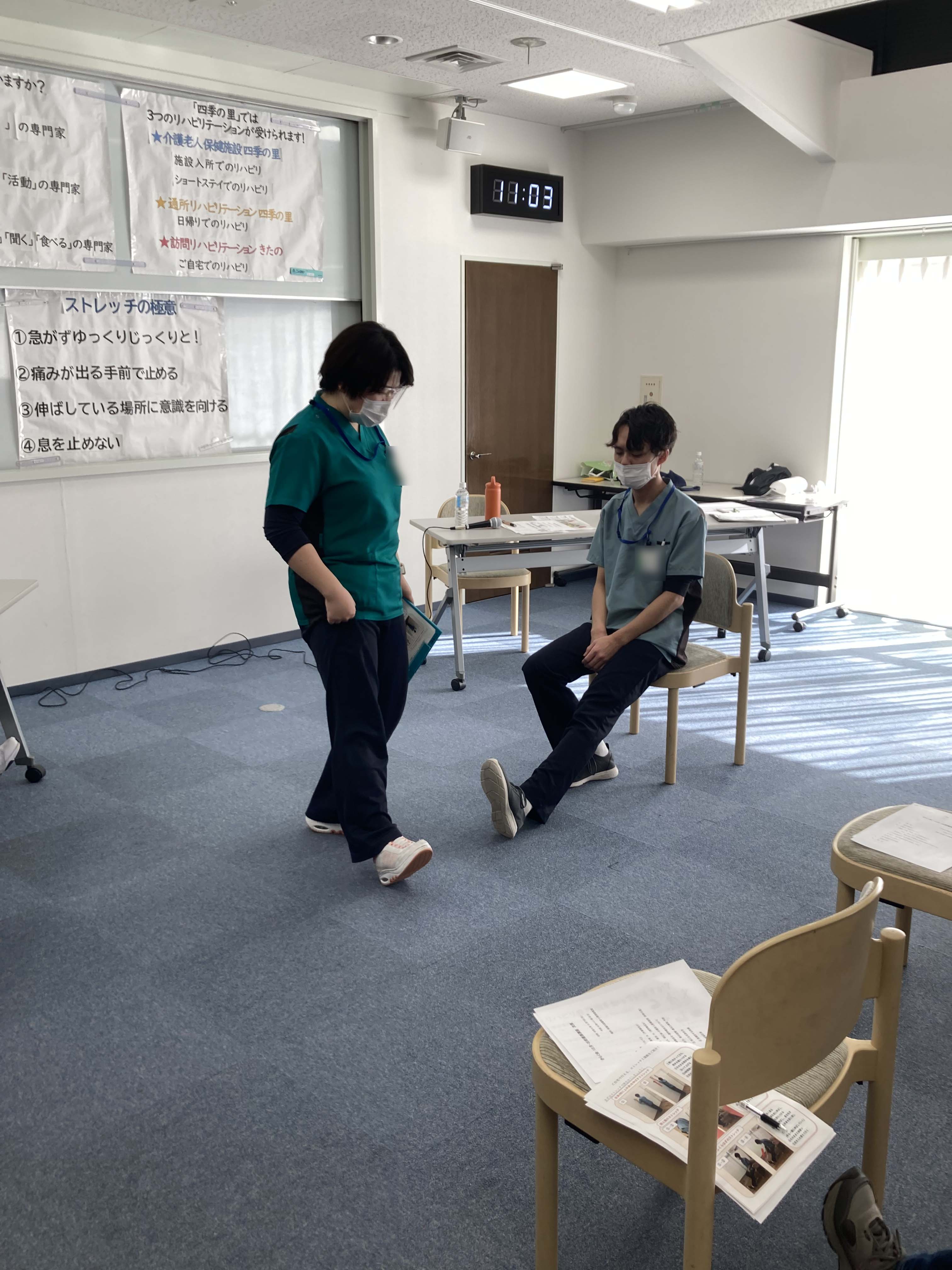 今回も、講義の初めに、当施設でのリハビリについてや、リハビリ専門職の種類についてもお話しさせていただきました。リハビリという言葉は聞いたことがあっても、実際にどんな職種があるのか、どんなことをやっているのかをご存じない方へ、このような活動を通じてリハビリについて知って頂く機会にもなっています。